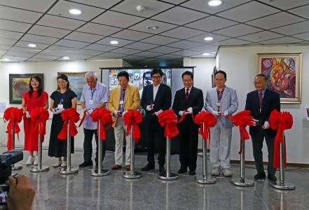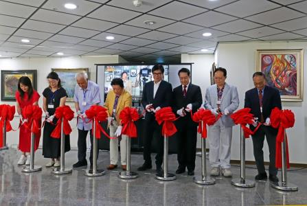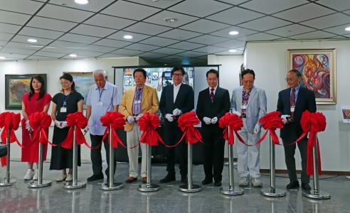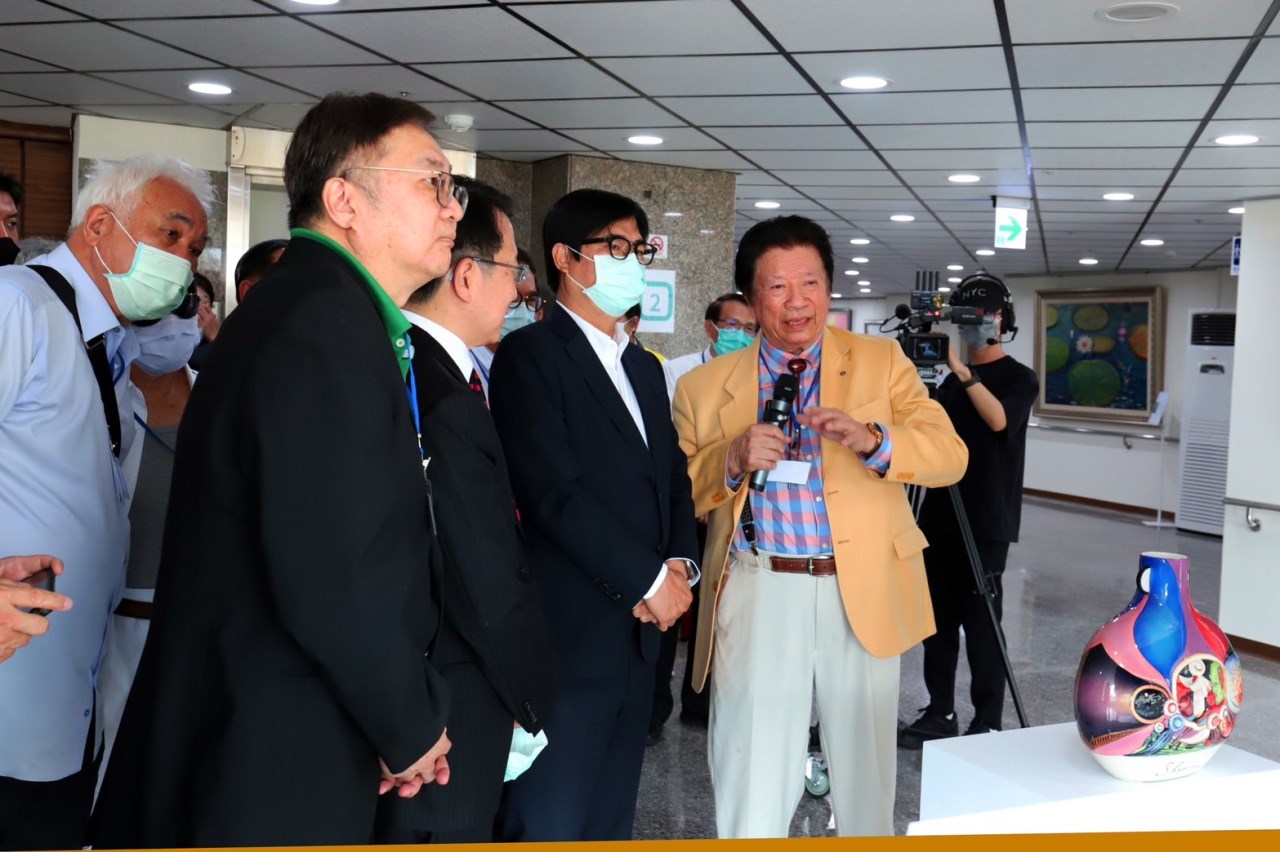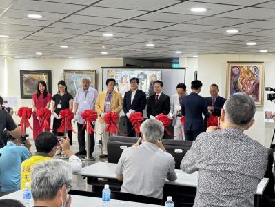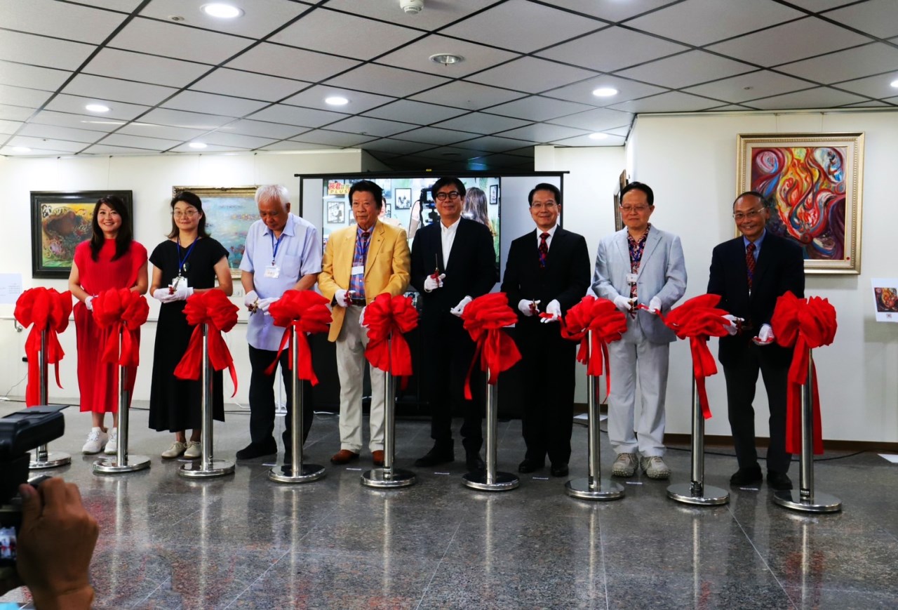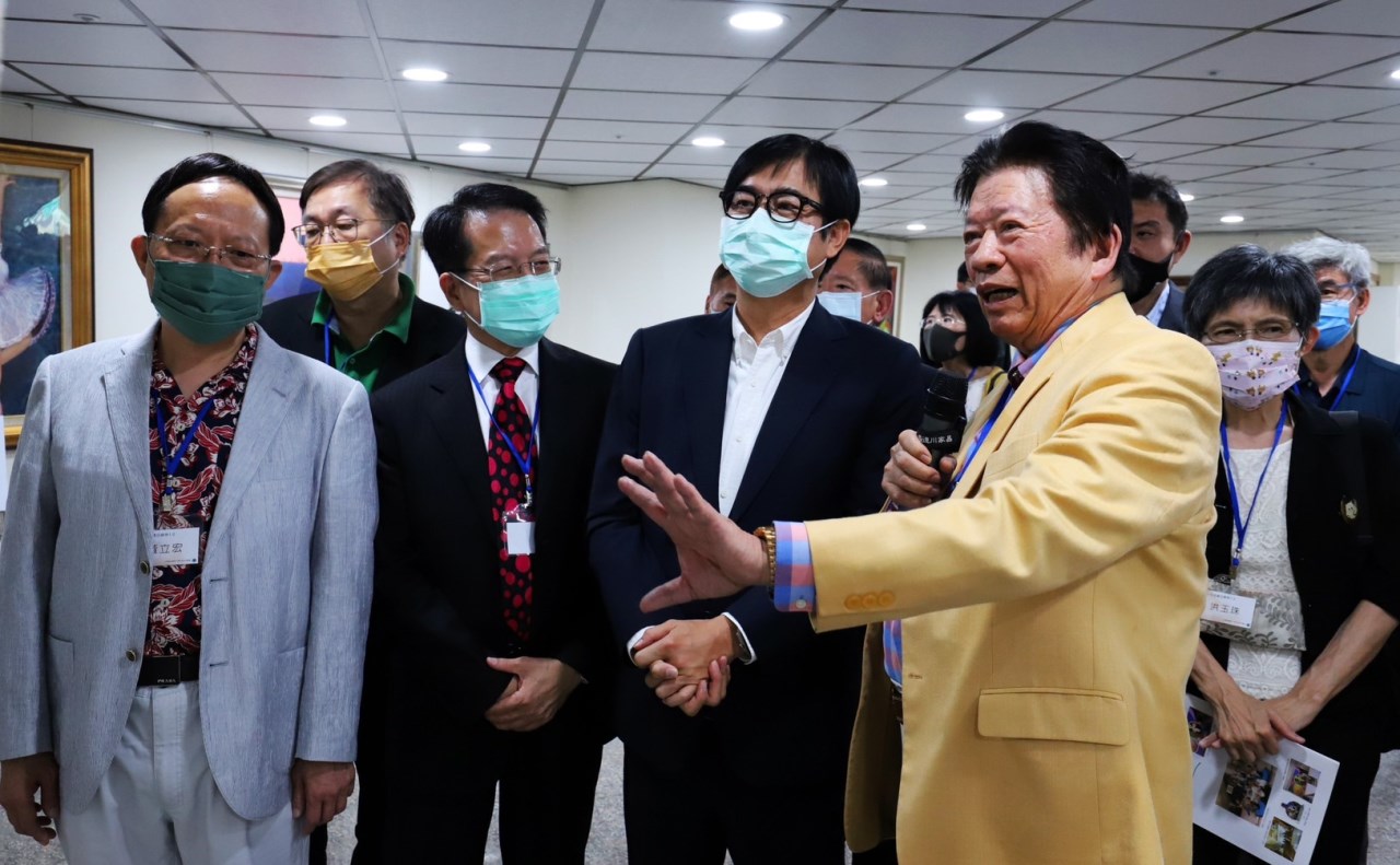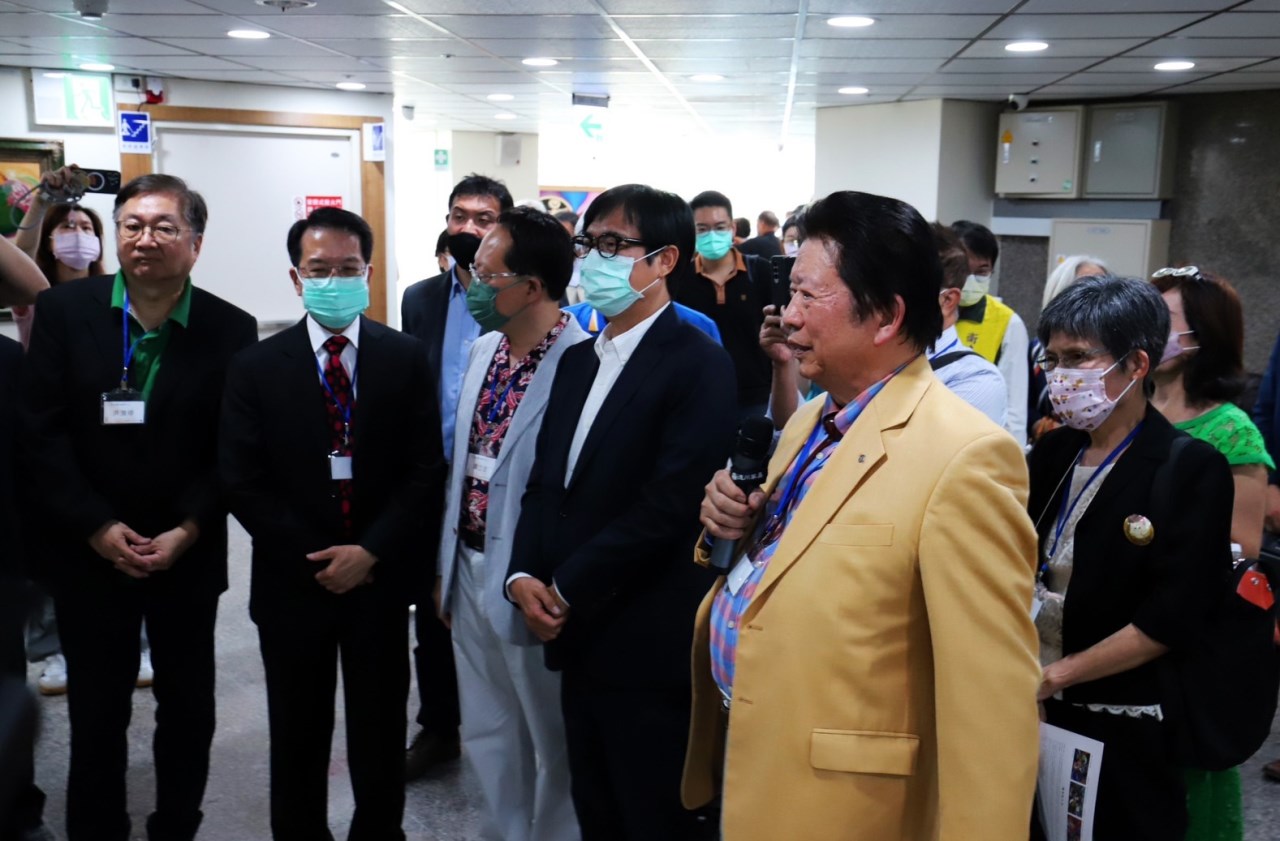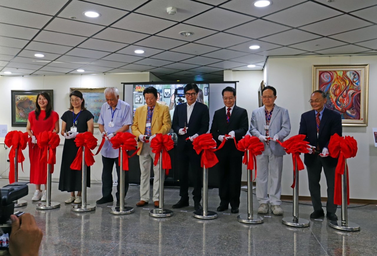 「施哲三博士八十五油畫回顧展1.0活動」 在港都長照中⼼(高雄市九如二路112號) 2 樓的會議展演廳剪綵後展開。高市長陳其邁、資政姚嘉文、杜聰明博士獎學基金會董事長杜武青、主持人廖筱君、台灣高醫大全球校友總會理事長陳國昭、副理事長黃立宏、高市美術館館長等進行剪綵。